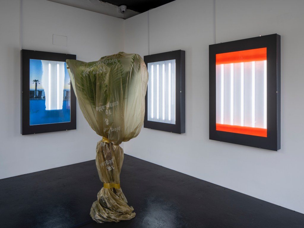 The golden covering that rotates at the center of the exhibition space with three electronic displays behind it is also borrowed from the pandemic-ridden streets and demonstrates the unpredictable future suggested by the damaged billboards. Under the gilded wrapper is a figure of a plant that has spread globally through a logistics network as a counter response to the immobility in the time of COVID-19. It’s a palm tree. As cities, including their restaurants and cafes, were under lockdown for months due to COVID-19, the palm trees that once decorated these spaces were left unattended for a while, like the billboards. While the withered and lifeless palm trees were quickly discarded after the lockdowns were lifted, they were soon distributed deep into every corner of our everyday life under the disguise of a newly introduced merchandise.